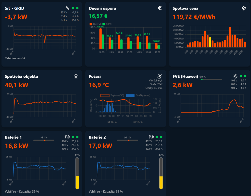 Výsledek? Firma spotřebovala maximum vlastní vyrobené elektřiny, chytrým načasováním dobíjení snížila náklady na odběr ze sítě a zároveň se vyhnula drahým ranním hodinám.